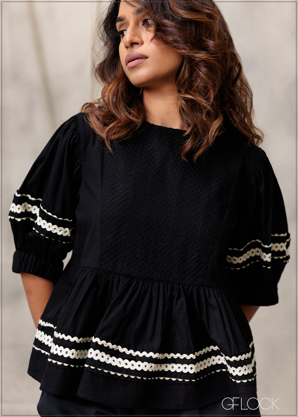 Puff Sleeve Contrast Trim Blouse - 260226